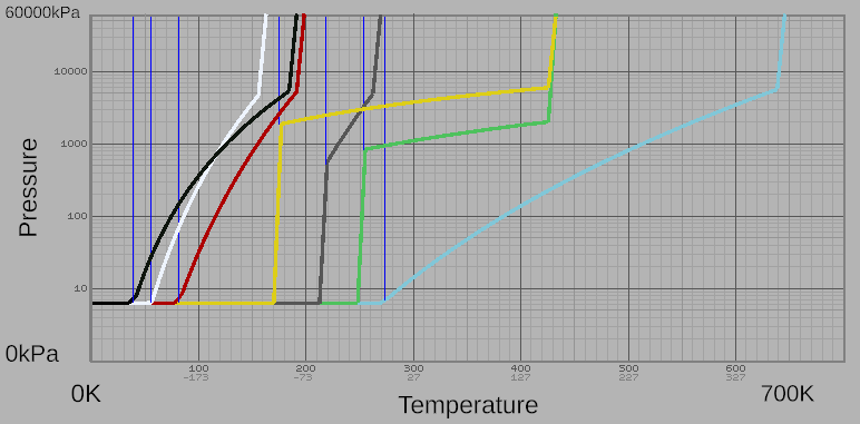 The summary of the aforementioned properties define how a given gas behaves depending on the temperature and pressure at which it is contained. By accessing in-game Stationpedia, a player can find a phase diagram for any such gas in a logarithmic scale. A composite diagram for all gases looks like this: